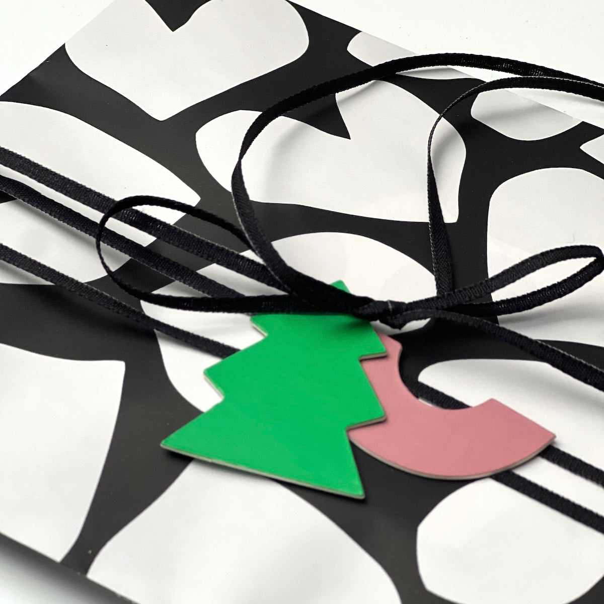 Anhänger aus fester Pappe. Ideal um Geschenke aufzupeppen oder für deine Weihnachtsdeko. Mit schwarz-weißem Baumwollband.