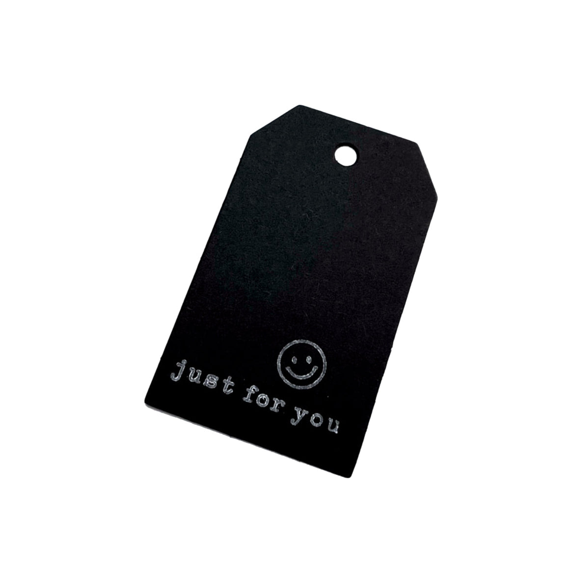 Anhänger aus schwarzer Pappe mit von Hand gestempeltem Motiv.