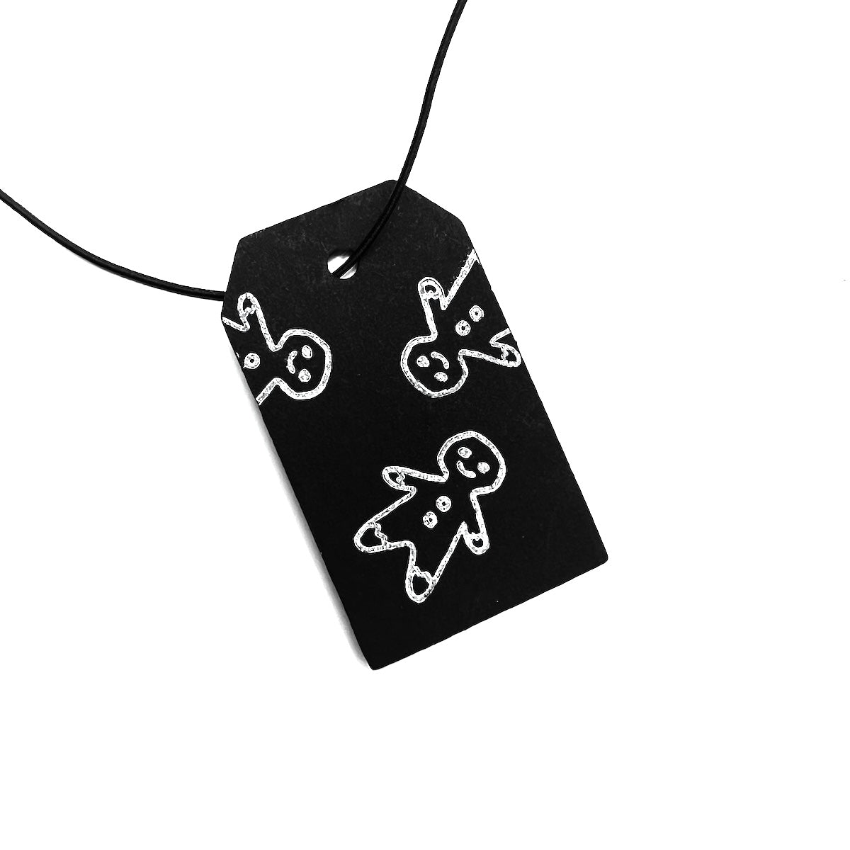 Anhänger aus schwarzer Pappe mit von Hand gestempeltem Motiv.