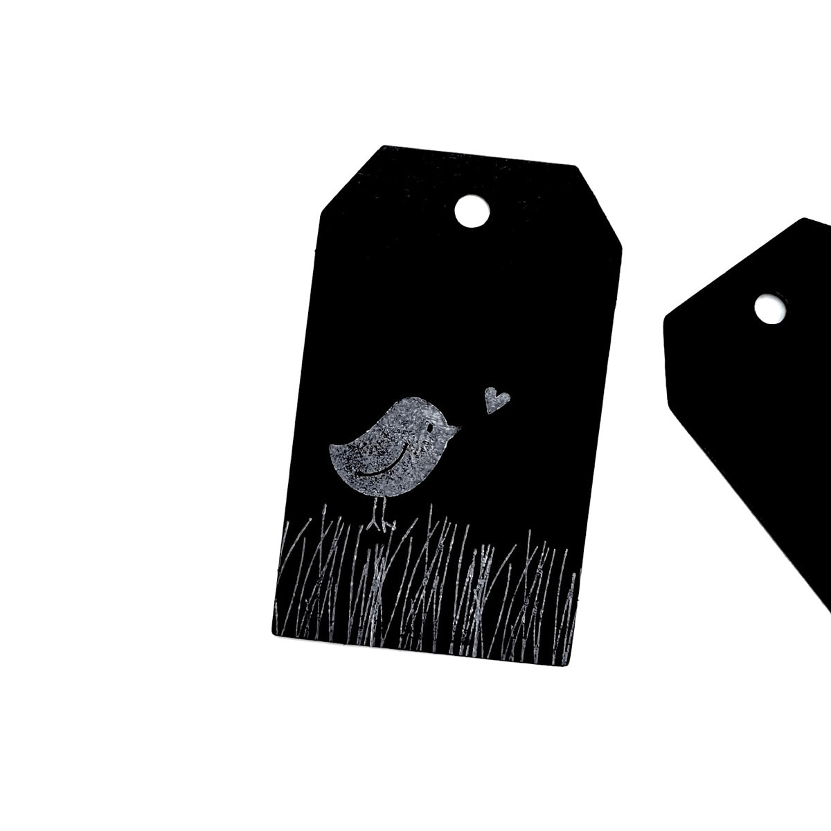 Anhänger aus schwarzer Pappe mit von Hand gestempeltem Motiv.
