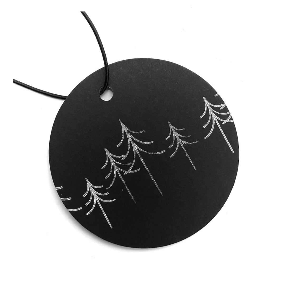 Anhänger aus schwarzer Pappe mit von Hand gestempeltem Motiv.
