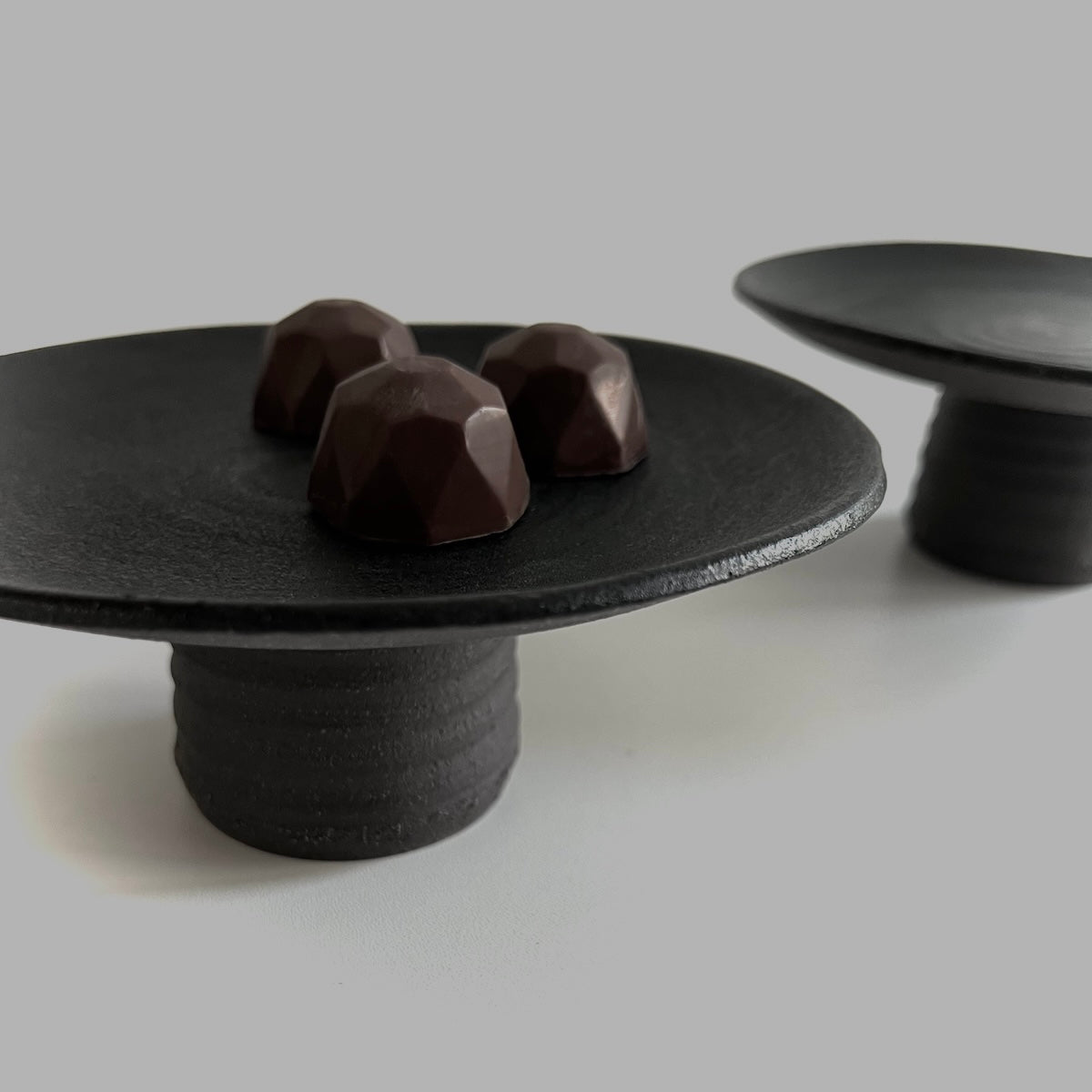 Etagere aus schwarz matter Keramik (passt zu den Small-, Big- und Bubble Cups, sowie zu den Plates s.o.) mit unglasiertem Fuss. Jedes Objekt wurde mit viel Liebe und vielen Stunden Handarbeit gefertigt und ist ein Unikat. Unregelmäßigkeiten in Form und Farbe sind gewollt.
