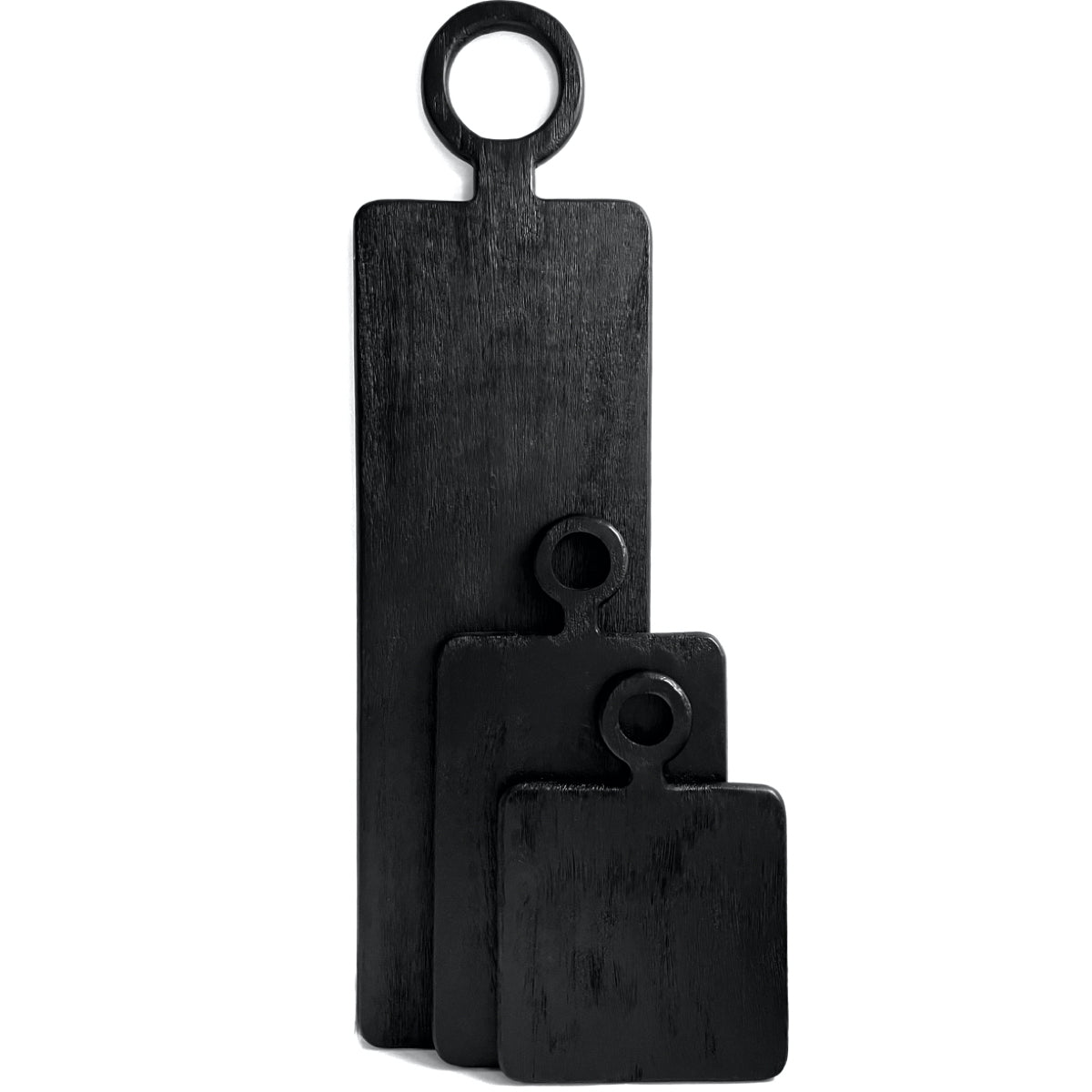 Wunderschönes eckiges Holzbrett in drei unterschiedlichen Größen. Jedes Brett wurde schwarz gebeizt, lebensmittelecht.