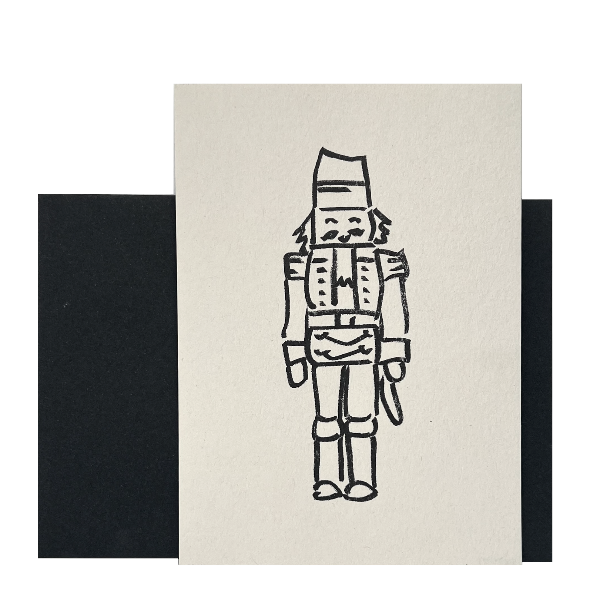 Postkarte mit Nussknacker Print. Solo oder mit schwarzem Umschlag erhältlich. Karte aus recyceltem 300g Gemund Papier.