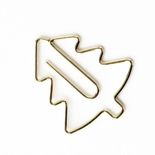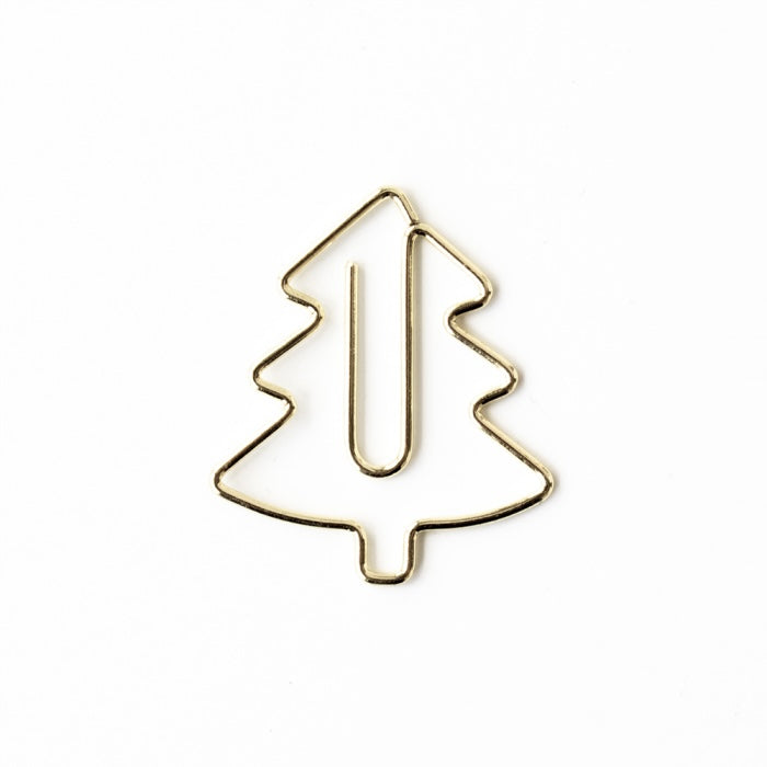 Filigrane goldfarbene Büroklammer in Form einer Tanne. Damit lassen sich Weihnachtsgeschenke aufpeppen!