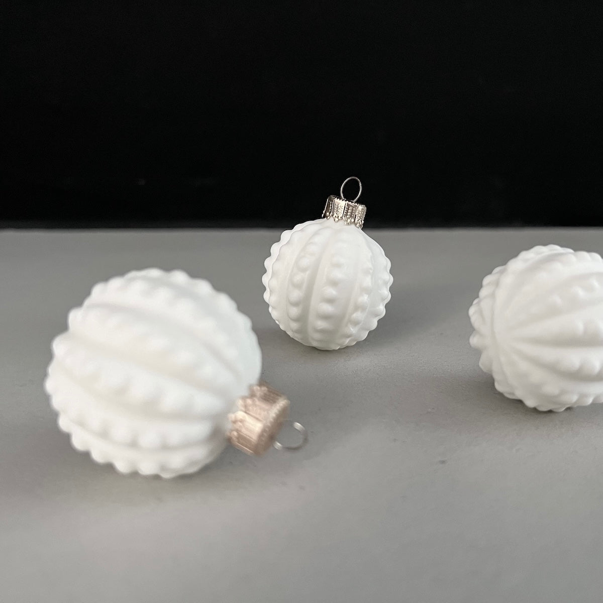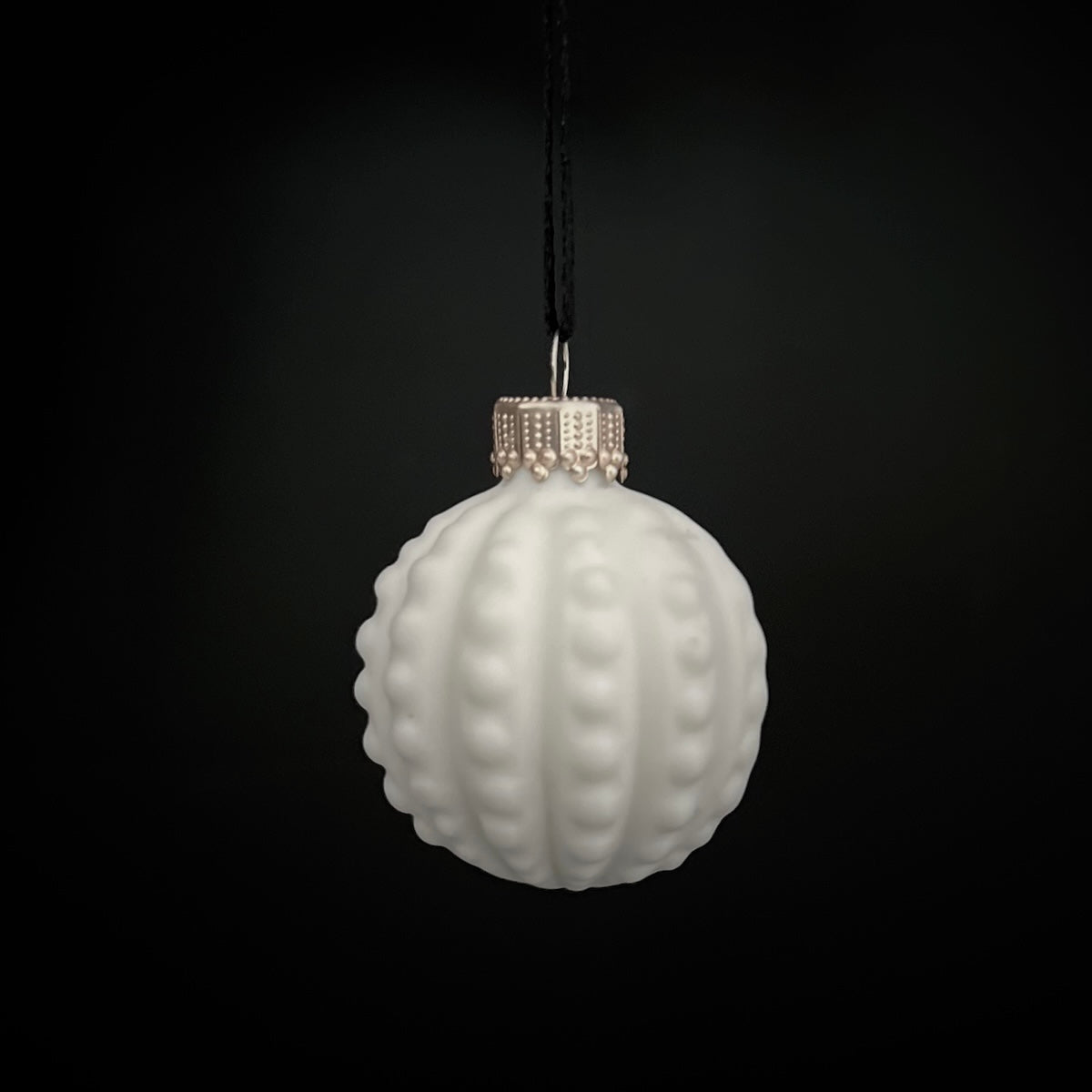 Die kleine Porzellankugel besticht durch ihre matt struckurtierte Oberfläche. Jede Weihnachtskugel wurde in liebevoller Handarbeit und etlichen Stunden gefertigt. Minimale Unterschiede in der Form können vorkommen und sind von der Künstlerin Cornelie Weiss ausdrücklich gewollt. Porzellan Kunst made in Düsseldorf. Im .