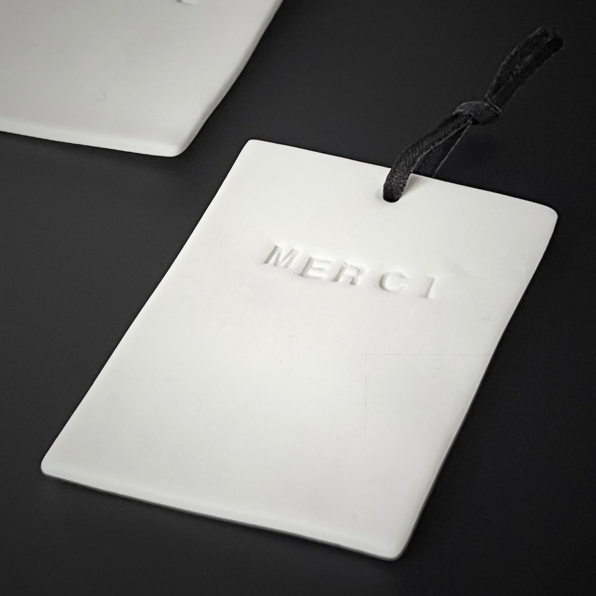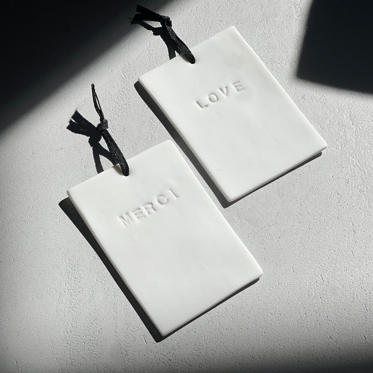 Kleines Kunstwerk aus matt weißem Porzellan, mit von Hand geprägtem Schriftzug. Ich finde eine es eine super liebevolle Idee. Jedes kleine Objekt ist ein Unikat, made in Düsseldorf. Mit schwarzem Bändchen zum aufhängen.